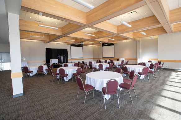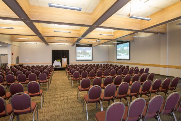 Make a lasting impression in this elegant and highly adaptable venue. A fully retractable wall of windows fills the room with natural light and opens onto a spacious private patio, offering breathtaking views of the TRU Campus Commons and the surrounding Kamloops mountain landscape. Perfect for creating a seamless indoor–outdoor atmosphere, this versatile space is perfect for spirited social gatherings, engaging conferences, standout special events, and unforgettable weddings.